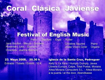 Am 23.05.2008 findet um 20.30 in der Iglesia de la Sta. Cruz in Pedreguer, Alicante ein Chorkonzert des Coral Clásica Javiense statt. Das Konzert steht unter dem Motto "Festival of English Music". Dargeboten werden u.a. Werke von Parry, Stanford, Elgar und Rutter. Unsere Kanzlei unterstützt den Chor bei der Produktion der Werbeplakate.